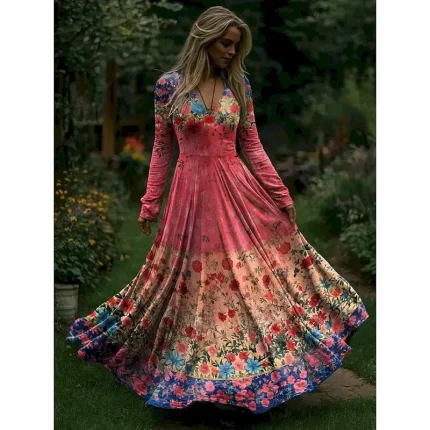 Christmas Women’s Maxi Dress Pleated Dress Party Casual Boho Daily Date Going out Regular Fit Floral Long Sleeve V Neck Dark Pink Spring Fall Winter