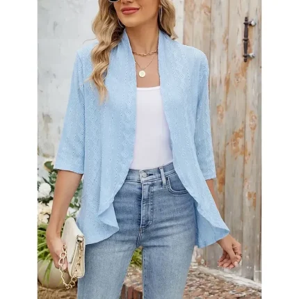 Women’s Casual Jacket Breathable Comfortable Ruffle Casual Plain Vacation Street Casual Daily Wear Open Front Regular Collarless Regular Fit 3/4 Length Sleeve Outerwear Black White Pink Summer Spring