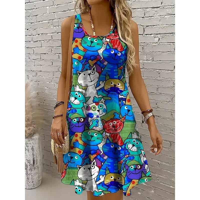Women’s Mini Dress Sundress A Line Dress Off The Shoulder Dress Vacation Casual Holiday Beach Regular Fit Graphic Cat Sleeveless Crew Neck Yellow Red Blue Purple Summer Spring