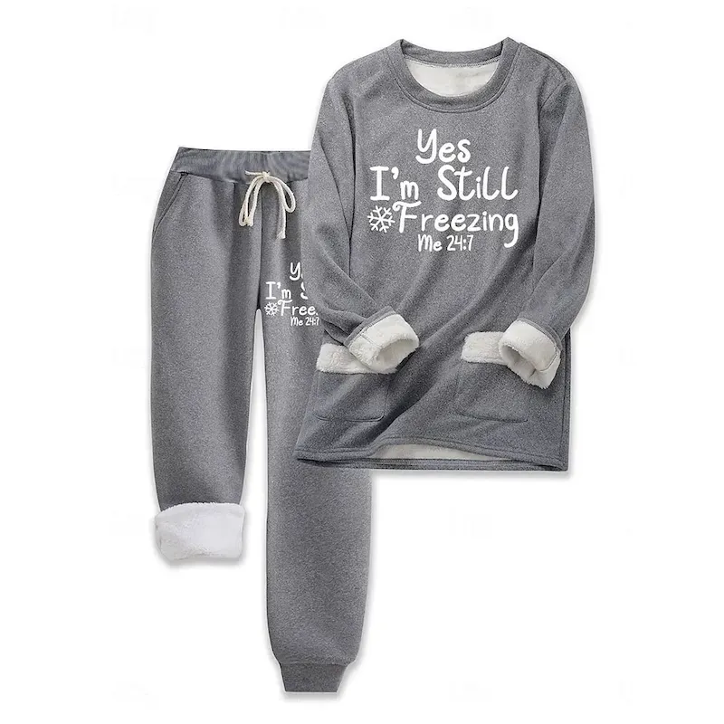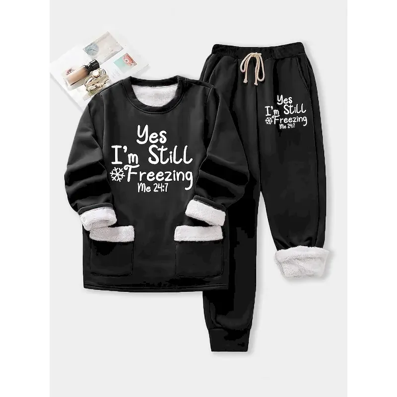 [Fabric]: Crafted from a blend of polyester and fleece, this women’s loungewear set is designed for softness and warmth. The micro-elastic material ensures a comfortable fit, perfect for chilly fall and winter days.[Fit]: Featuring a regular fit, both the top and pants are designed to provide ease and comfort. The top comes with long sleeves and a crew neckline, while the matching pants include an elastic waistband with a drawstring for adjustability.[Design Highlights]: The top is adorned with fluffy white fleece accents on the cuffs and large front pockets for added style and function. It showcases the playful phrase “Yes I’m Still Freezing Me 24:7” on the front, adding a touch of humor. The pants feature cuffed ankles to retain warmth, ensuring you stay cozy.[Occasions]: Ideal for casual daily wear, this set is perfect for lounging at home or enjoying cozy evenings. Its practical yet stylish design makes it a great choice for relaxed settings during colder seasons.[Size Range]: The set is available in a variety of sizes including S, M, L, XL, and 2XL, ensuring a good fit for a range of body types.OK