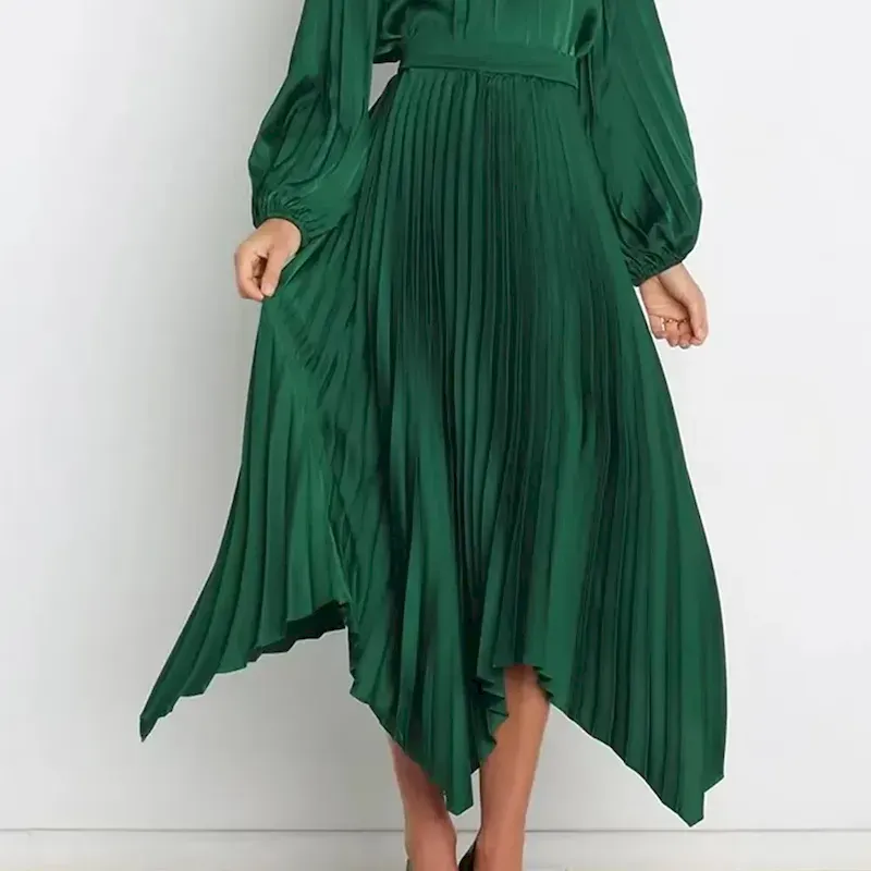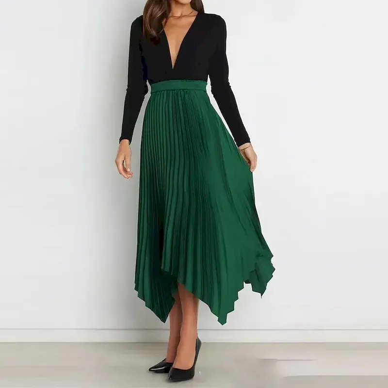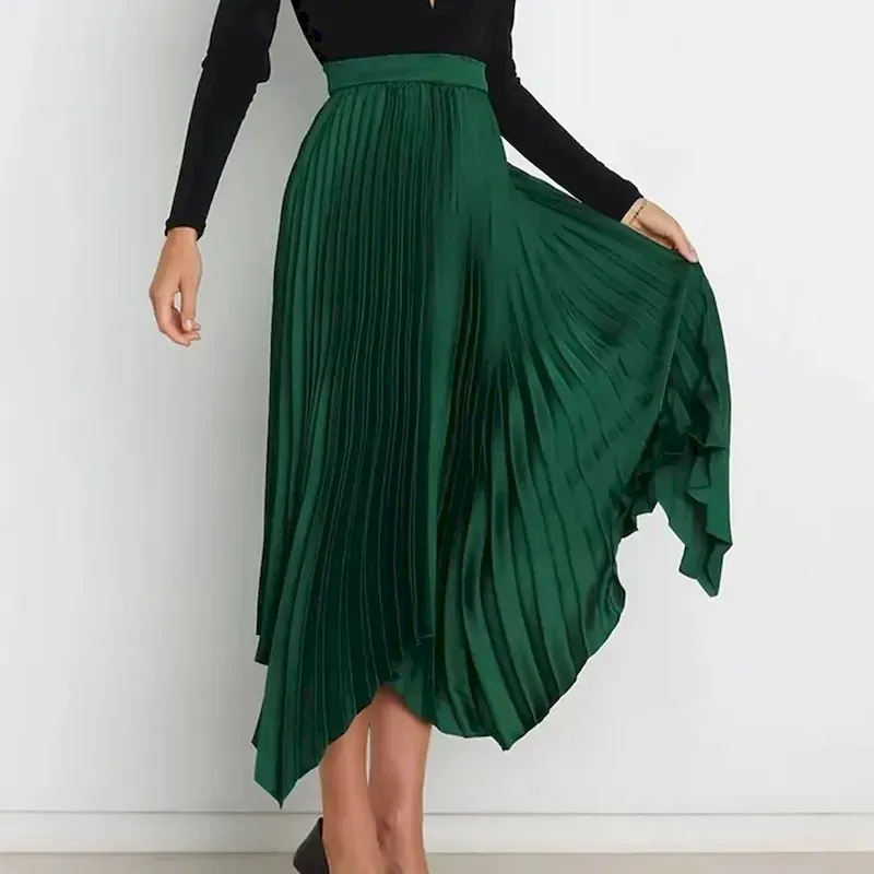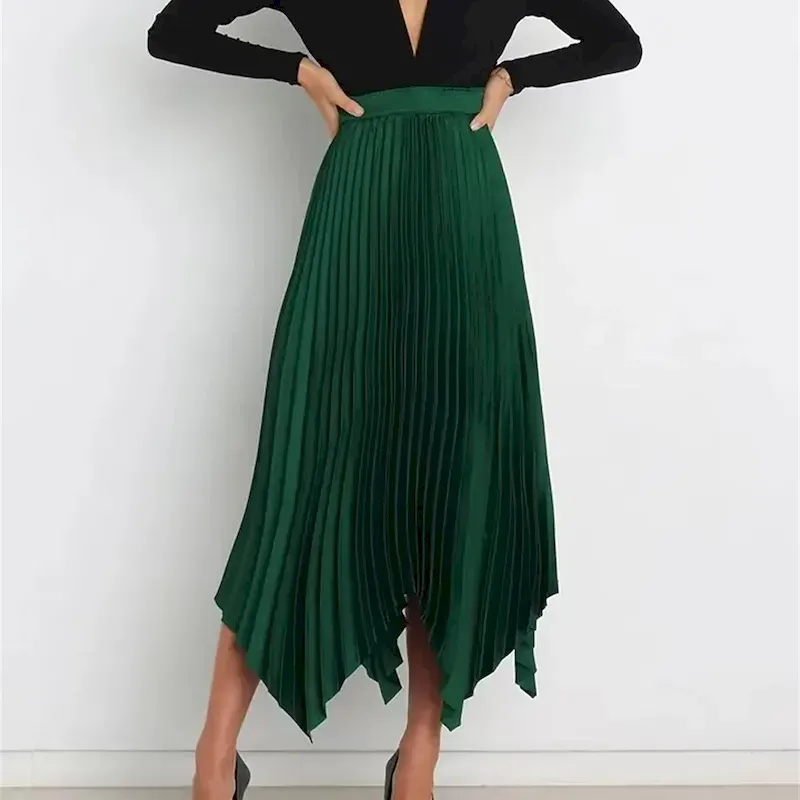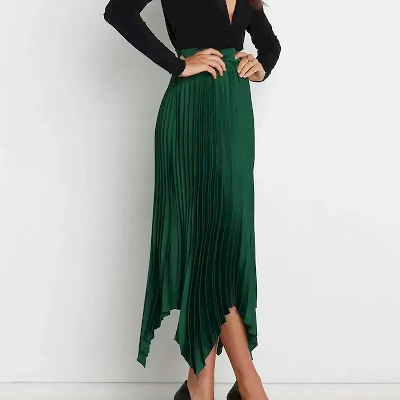[Design Highlights]: The skirt’s pleated texture and asymmetrical hemline add a contemporary edge to its classic style, creating a dynamic and eye-catching look. Available in a variety of solid colors, this versatile skirt can easily be matched with tops and accessories to achieve different styles.