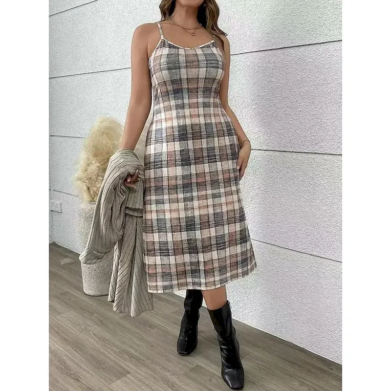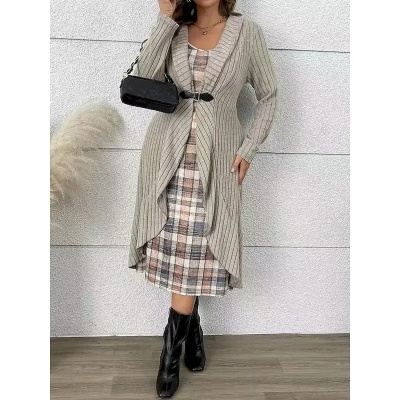 Women’s Sweater Sweater Dress Sweater Set Elegant Fashion Streetwear Plaid Ribbed V Neck Patchwork Print Long Sleeve Long Tops Knit Outdoor Daily Weekend Khaki Fall Winter