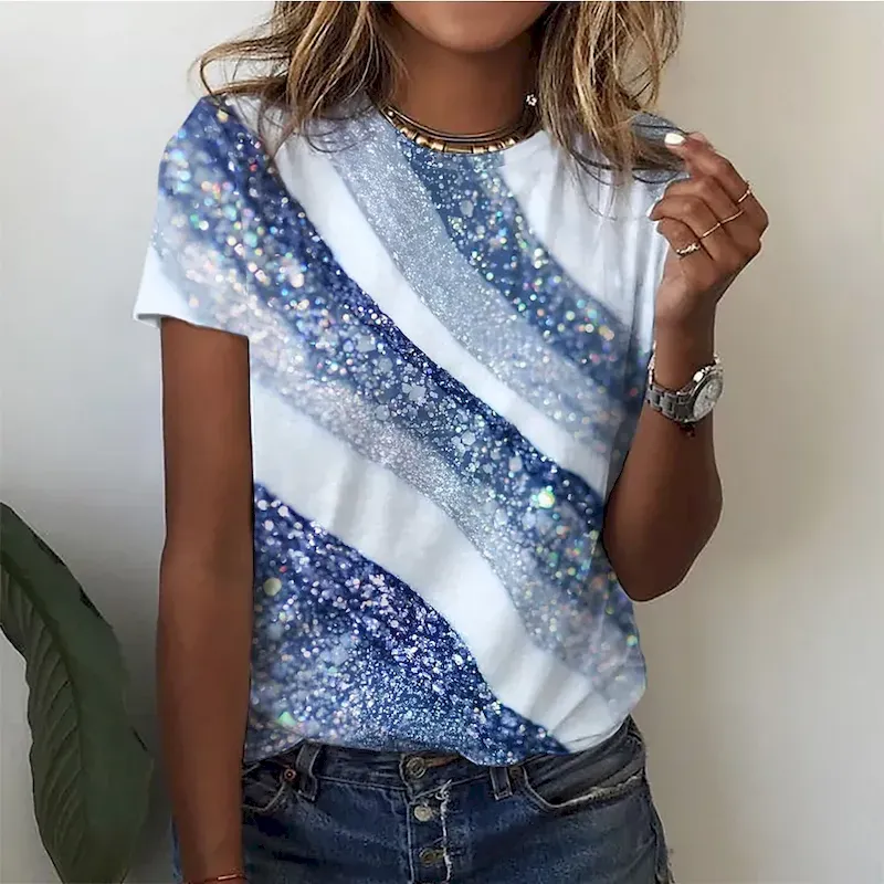 [Design Highlights]: Featuring a stunning graphic and texture print, this tee incorporates broad diagonal stripes filled with glittery patterns in silver, black, and white. The eye-catching design adds a splash of sparkle, making it a standout piece in any wardrobe.