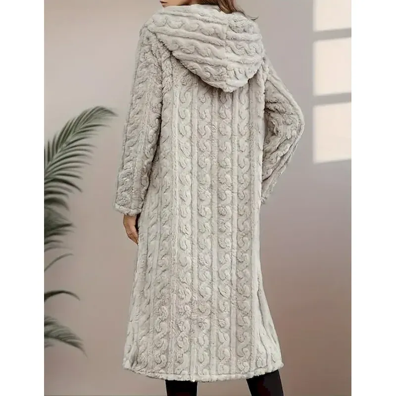 [Fabric and Texture] This women’s winter coat is crafted from high-quality polyester and fleece, providing a warm and breathable wear during the colder months. The soft, knit fabric ensures comfort, making it perfect for both fall and winter seasons.[Design and Fit] Featuring a long, loose-fitting silhouette, this coat offers a relaxed and contemporary style that drapes gently over the body. It includes a wide lapel collar that enhances its sophisticated look while providing additional warmth around the neck. The buttoned front adds a sleek and functional touch.[Design Highlights] The coat showcases a subtle vertical knit pattern that adds a modern flair to its solid light grey color. This design, combined with the chic, long sleeves and a hoodie neckline, makes it a stylish choice for various occasions. [Occasions] Suitable for daily wear, street outings, and weekend gatherings, this versatile coat can seamlessly transition from casual to slightly more formal settings. It’s perfect for pairing with jeans for a casual day out or layering over a dress for an evening out, enhancing any outfit with elegance.[Size Range] Available in a range of sizes from XL to 4XL, this coat accommodates various body types, ensuring a flattering fit for many.OK