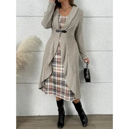 Women’s Sweater Sweater Dress Sweater Set Elegant Fashion Streetwear Plaid Ribbed V Neck Patchwork Print Long Sleeve Long Tops Knit Outdoor Daily Weekend Khaki Fall Winter